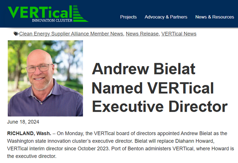 RICHLAND, Wash. – On Monday, the VERTical board of directors appointed Andrew Bielat as the Washington state innovation cluster’s executive director.